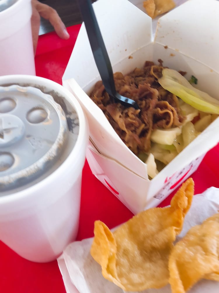 White rice, wok cooked veggies cabbages, broccoli, zucchini, carrots, Japanese beef simmered in teriyaki sauce.